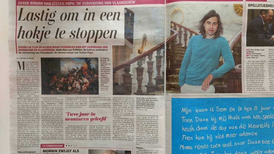 Over een paar dagen ligt De verovering van Vlaanderen in de betere boekhandel. Dat is mooi, dat is nieuws. Dat vond De Telegraaf gelukkig ook, dus hebben Bertjan ter Braak en ik urenlang koffie gedronken, smakelijke koekjes gegeten, en gesproken over mijn vorige romans (die hij speciaal voor het gesprek allemaal heeft gelezen: hulde!) en het boek dat komen gaat. Dat gesprek is teruggebracht naar een fijn interview in De Telegraaf van vandaag. Trefwoord: groots.